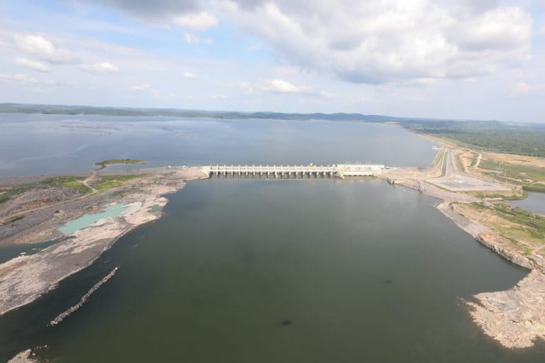 On November 27, 2019, Brazilian President Jair Bolsonaro, with wife Michelle Bolsonaro beside him (next to plaque), celebrated the official end of Belo Monte mega-dam construction as its last turbine was installed. The banner reads, “Belo Monte Hydroelectric Plant: Brazilian Giant, Fully Operational.” Photo credit: Palácio do Planalto on VisualHunt / CC BY.