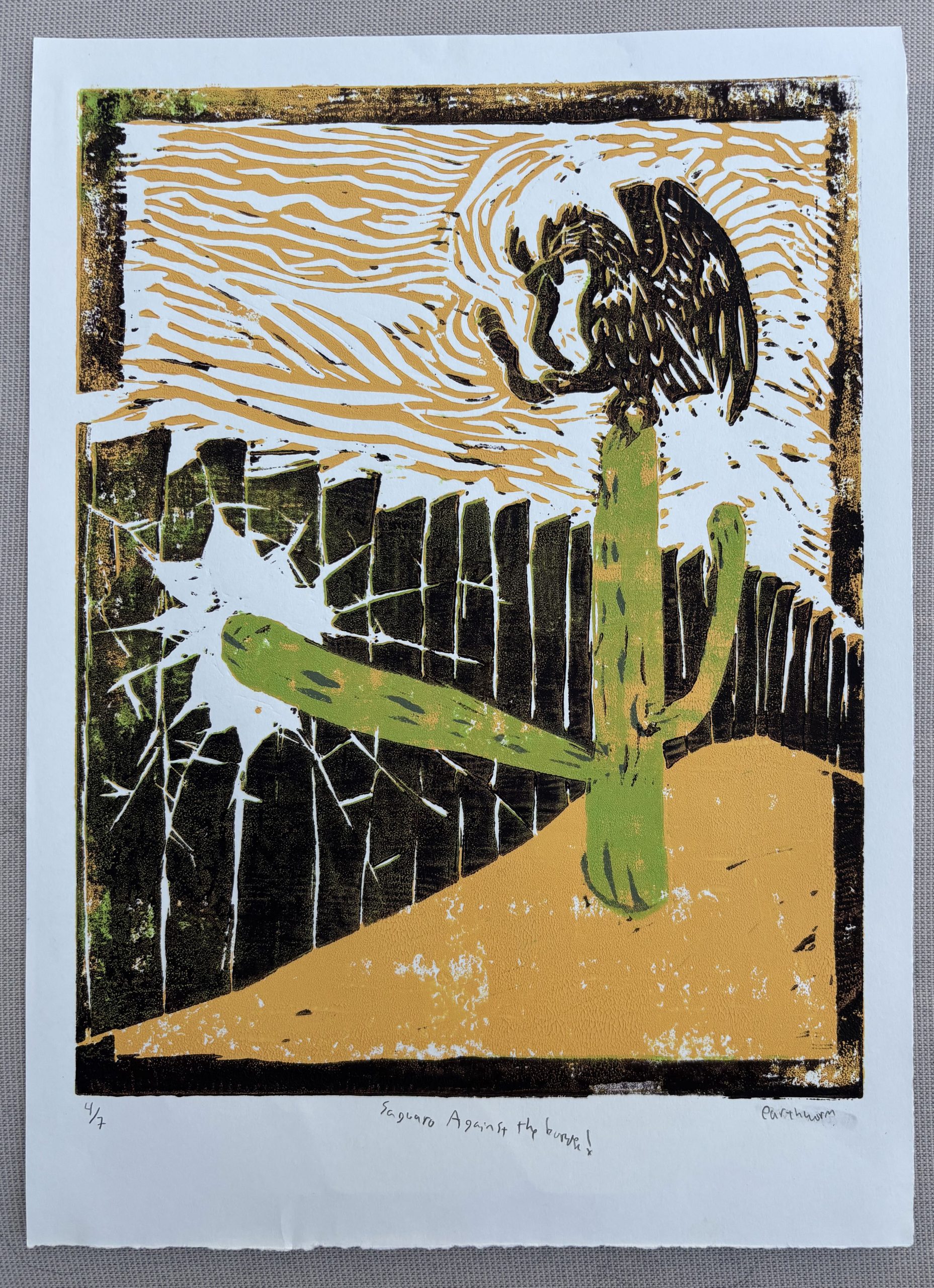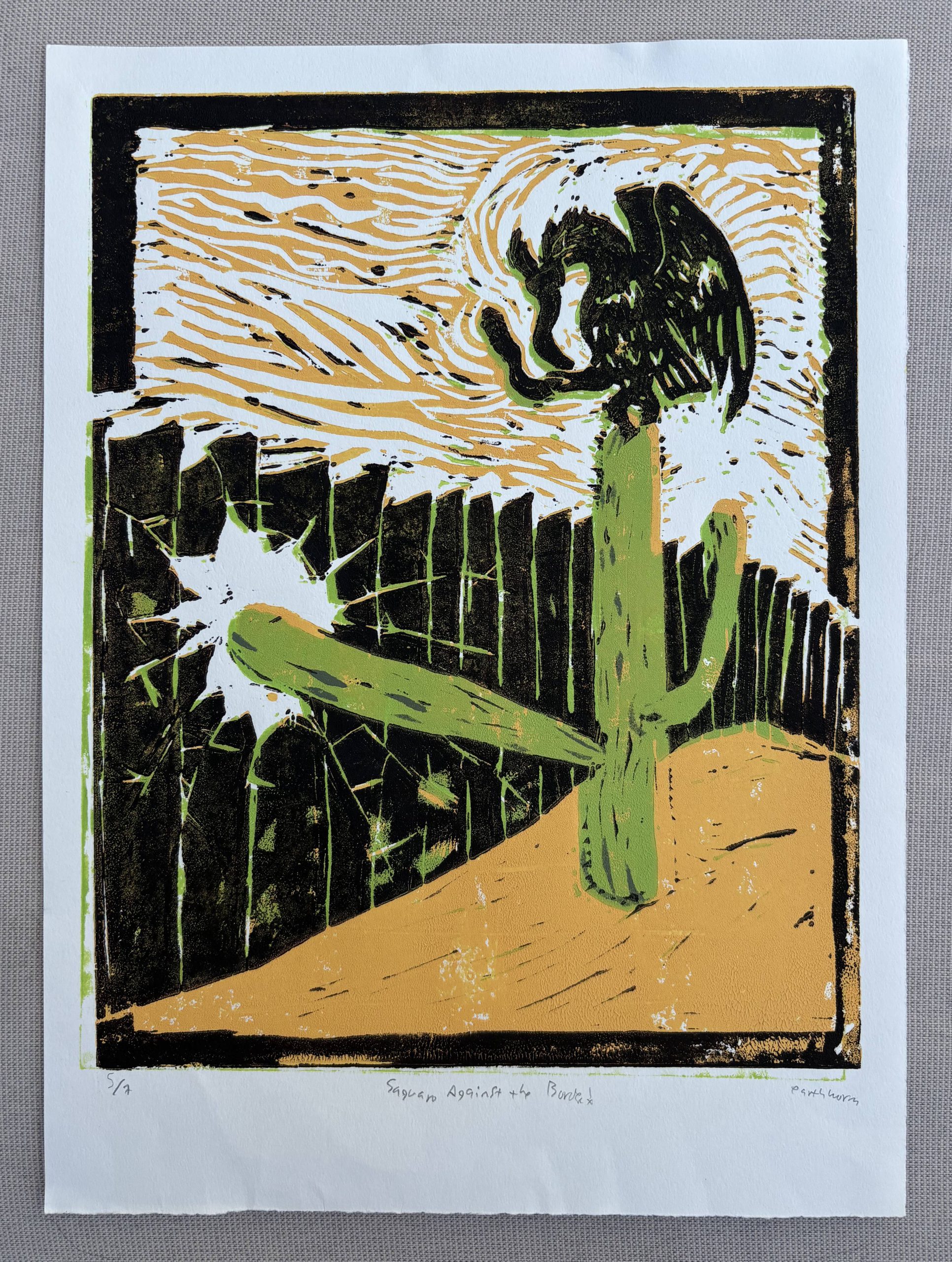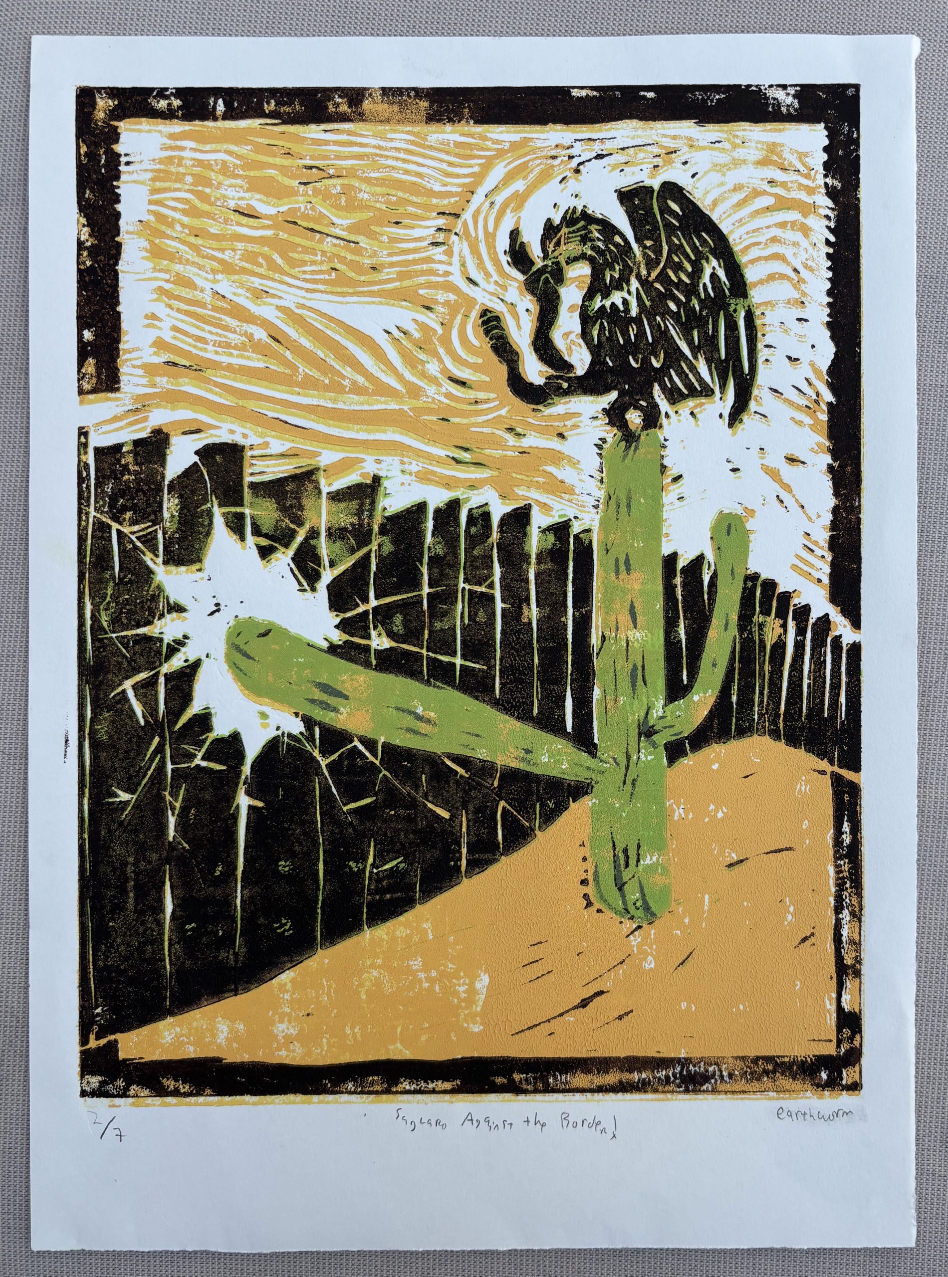 Saguaro’s Against Borders is reduction linocut using stencils to add touch-up detail. It depicts a saguaro cactus punching through the border wall. There is an eagle holding a rattlesnake sitting on the cactus observing their actions. The border wall not only makes human migration more dangerous and challenging but also disrupts ecological communities and other-than-human migration. This print represents a cross-species solidarity towards collective liberation of all beings.