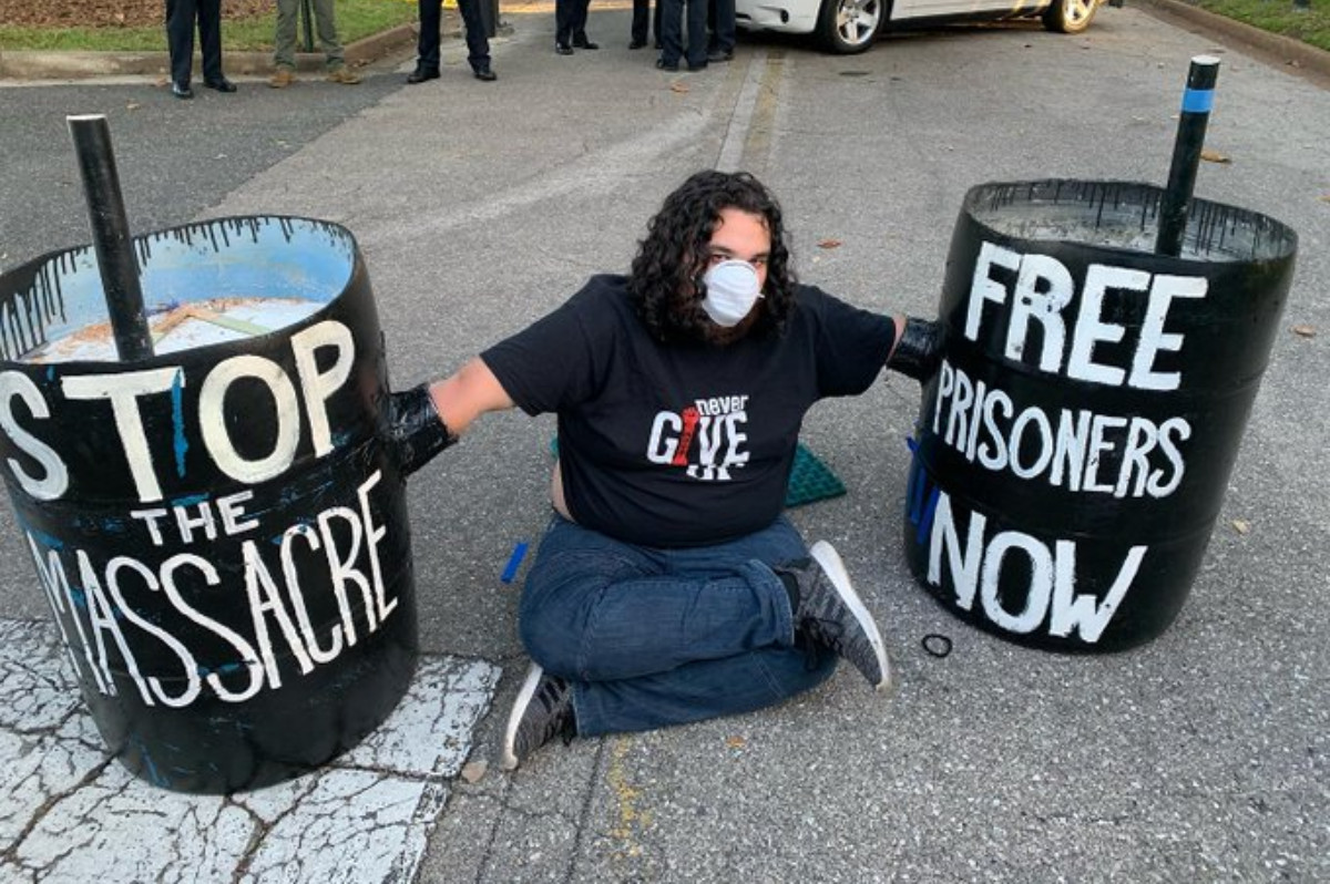 At 5am EST on April 17th 2020, a person locked themself to two concrete barrels in front of the mansion of Florida Governor Ron Desantis. The demands are the same as they have been for the past month: all incarcerated people must be immediately released during the covid19 pandemic, and in the mean time they must be given protective and sanitation supplies, and free and full access to communication.
