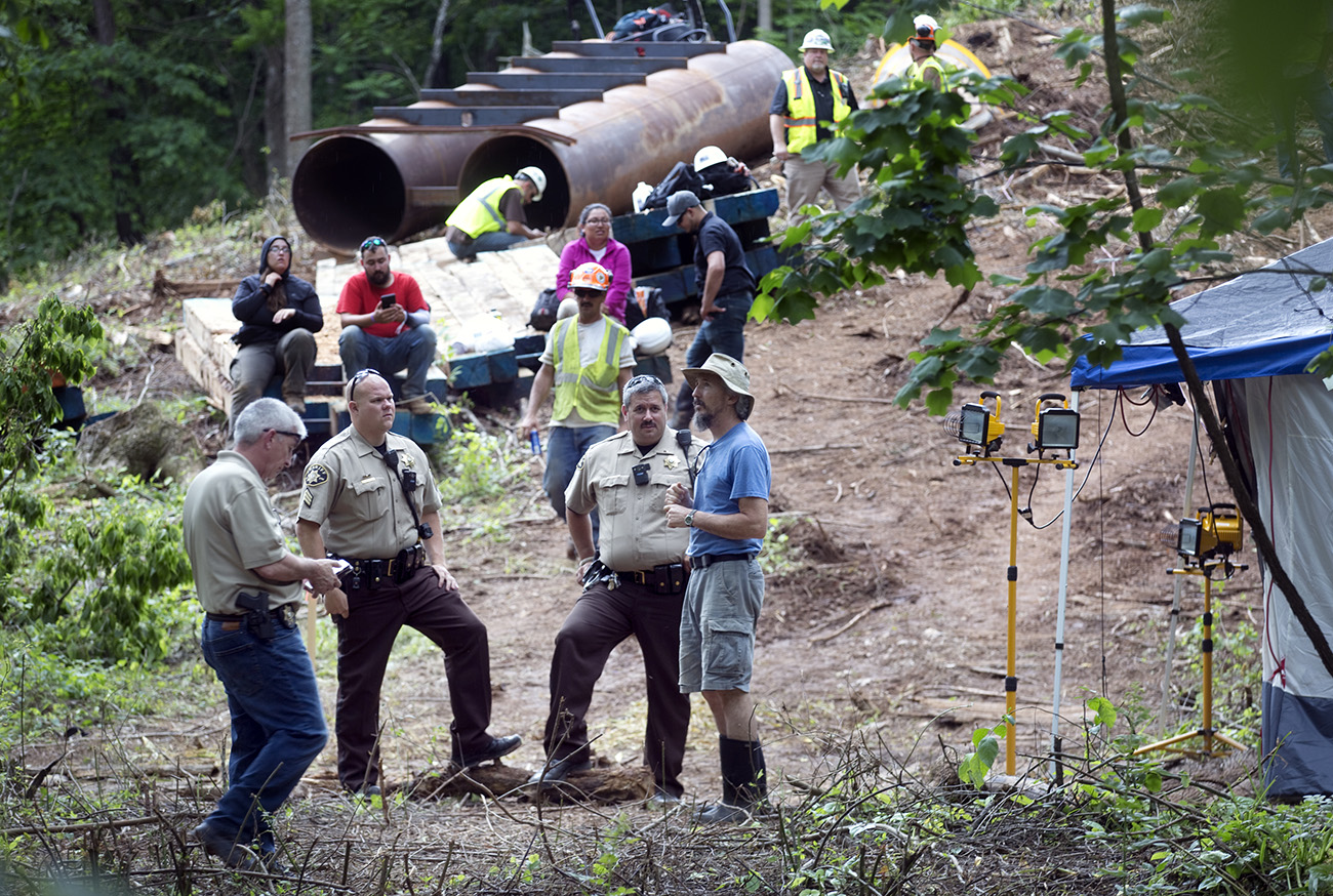 Ian Reilly speaks with officers from the Franklin County Sheriff’s Department as Mountain Valley Pipeline crews work on a natural gas pipeline on Reilly’s family land in Rocky Mount, Va., Monday, May 28, 2018. (Heather Rousseau/The Roanoke Times via AP)