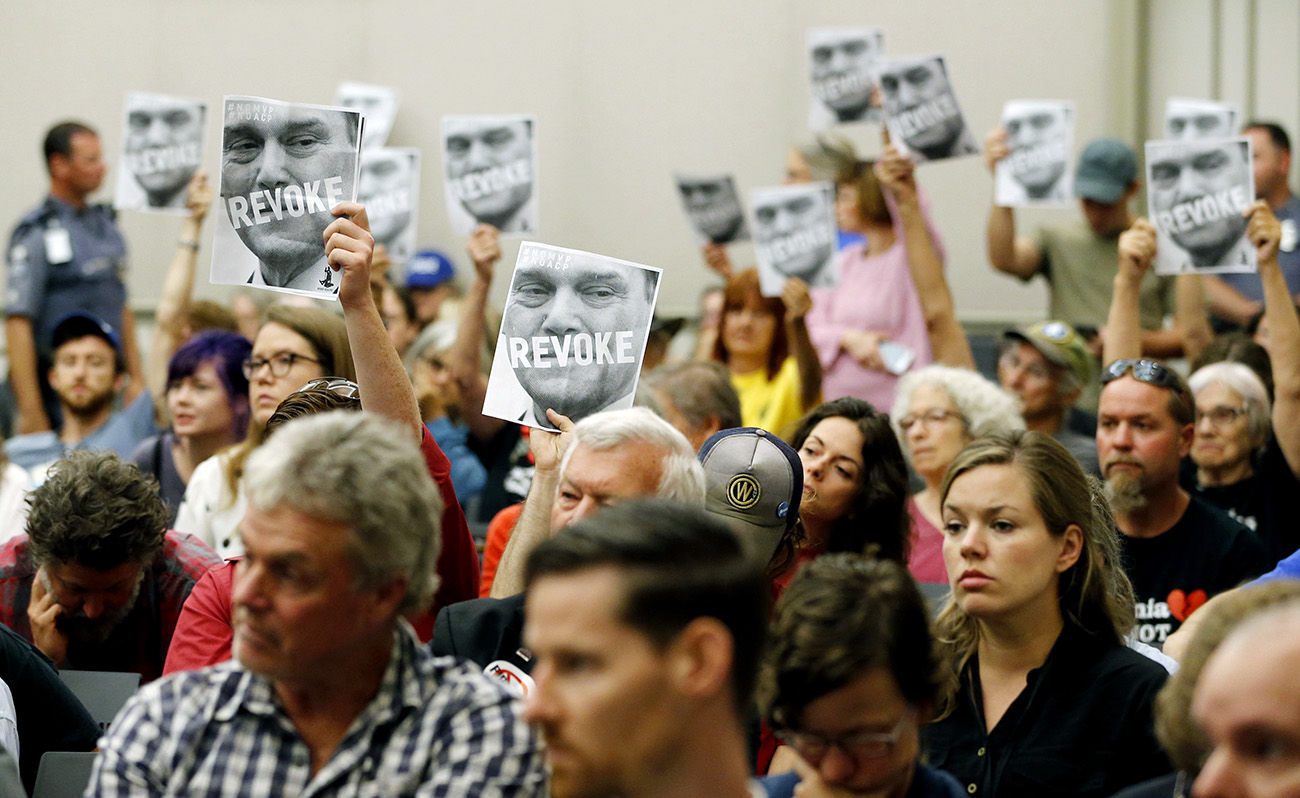 Pipeline opponents attend a meeting of the State Water Control Board in Richmond, Va., on Tuesday, Aug. 21, 2018. The board ordered more aggressive enforcement of water quality standards, but stopped short of revoking the permits for both the Atlantic Coast and Mountain Valley pipelines. (Joe Mahoney/Richmond Times-Dispatch via AP)