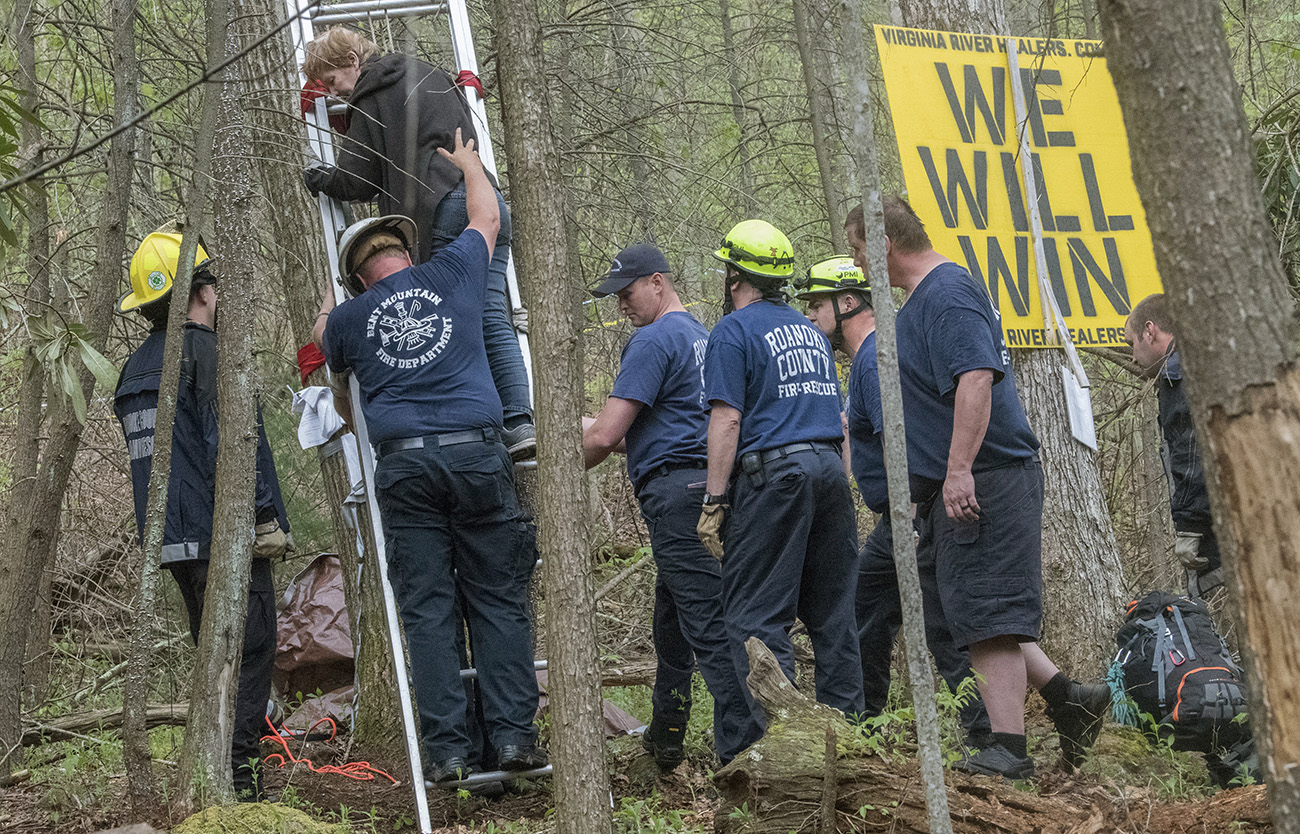 In a Saturday May 5, 2018 photo, protester, Theresa Minor Terry, top, leaves the tree stand she has occupied for the past five weeks along the Mountain Valley Pipeline route on Bent Mountain, Va., where she and her daughter have been protesting a natural gas pipeline granted eminent domain to run through their property, after a federal judge found her in contempt of a court order and she would have faced fines of $1,000 a day and perhaps forcefully removed by U.S. Marshals, so tree cutting could begin. (Don Petersen/Roanoke Times via AP)