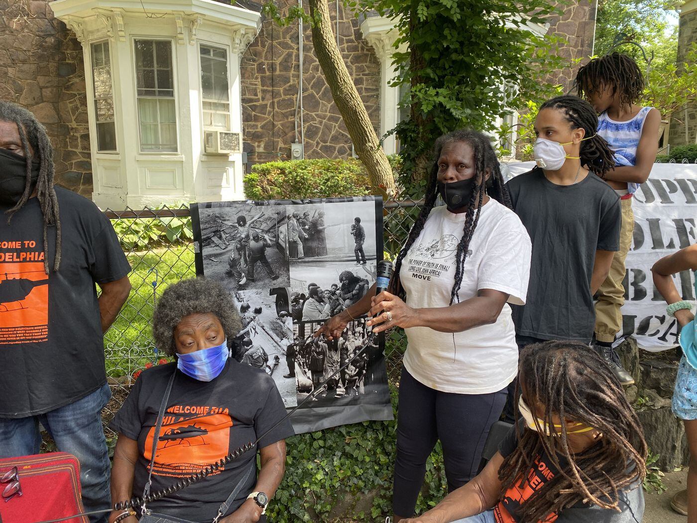 Consuewella Africa speaking at a news conference in Southwest Philadelphia June 16, 2020 held to announce the death of MOVE member Delbert Africa. She is pointing to pictures of the MOVE group’s house that was destroyed when Philadelphia police dropped a bomb on the building in May 1985. Photo by Mensah M. Dean.