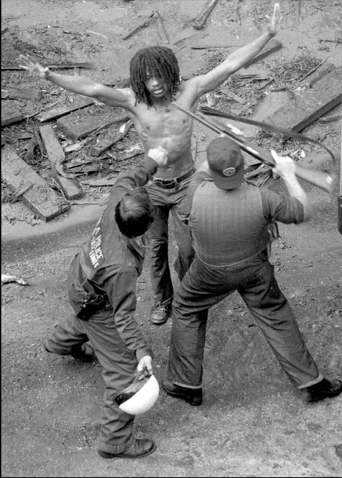 MOVE member Delbert Africa surrenders 8/8/1978 to police after a shoot out at MOVE headquarters in Philadelphia. Photo by James G. Domke, Inquirer Staff Photographer.