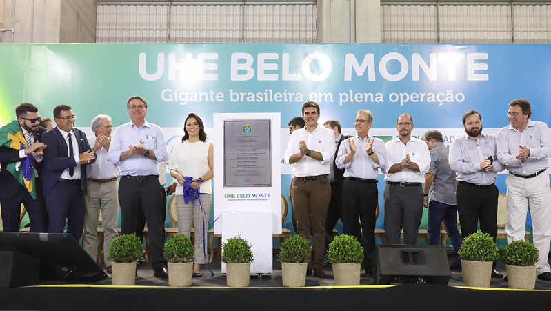 On November 27, 2019, Brazilian President Jair Bolsonaro, with wife Michelle Bolsonaro beside him (next to plaque), celebrated the official end of Belo Monte mega-dam construction as its last turbine was installed. The banner reads, “Belo Monte Hydroelectric Plant: Brazilian Giant, Fully Operational.” Photo credit: Palácio do Planalto on VisualHunt / CC BY.