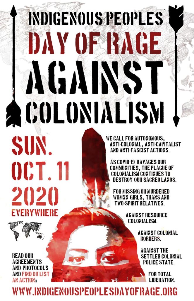This is a call for an Indigenous Peoples Day of Rage Against Colonialism on Sunday, October 11, 2020, everywhere.