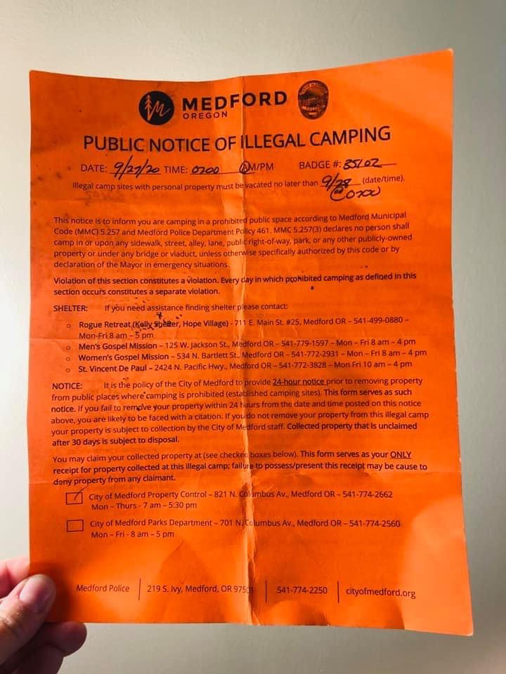 As a group working closely to provide aid to the homeless, several of my clients have repeatedly witnessed the displacement, ticketing, and arrest of homeless residents throughout the Rogue Valley for sheltering in public places over the last six months. This is after an announcement was made by the City of Medford that the homeless would be permitted to shelter in place along the Bear Creek Greenway during the COVID-19 pandemic. Local shelters are almost always full and have long waitlists, resulting in greater hardship and instability for our most vulnerable community members. As our valley confronts the heartbreak of having over 2400 dwellings and hundreds of businesses burned and air quality that was as hazardous as ever, we also have an opportunity to reflect on those who lose the places they call home five to ten times in a single year due to raids on their tent encampments by the City.