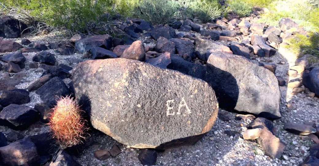 We near the end of our long walk. My legs are loose and beginning to burn. I am hot and mildly delirious, sitting in the scattered shade of an ironwood tree. One of my companions is poking around the volcanic boulder-field where we wait for the rest of our group to catch up. “Hey, check this out,” she yells, “There’s petroglyphs. Also, I think I found Edward Abbey’s grave.” “What?!” I’m jolted out of my stupor. “Holy shit.” We climb up the hillside. There are petroglyphs everywhere, spirals and circles and figures of burnt ocher inset against the black varnish that coats the rock. Among these old etchings, chipped into one of the blocks of pockmarked basalt, in careful, capital letters, a different kind of engraving: “EA.”
