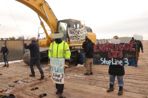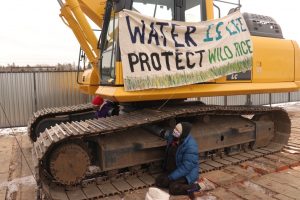 Two Inlets, MN – This morning, two water protectors locked their bodies through the treads of excavators working on a pump station for Enbridge’s Line 3 tar sands pipeline, as dozens of others rallied in support.