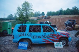 Just before 6 A.M. Tuesday morning, a Mountain Valley Pipeline protester locked themself to the inside of a broken down vehicle outside of Pembroke, VA, blocking access to a pipeline construction site. The vehicle’s doors were welded shut, the windows were covered with rebar, and the side was painted with the words, “Who Killed The World?” Nearby, over a dozen people gathered in support of the action.