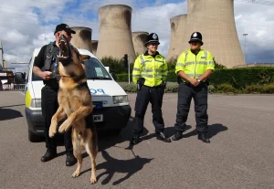 Tight security around Drax power station, where activists were gathering for a “Camp for Climate Action” in August 2006. Photo by John Giles/PA Images via Getty Images