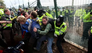 Police deal with climate change protesters at Ratcliffe-on-Soar power station in October 2009. Photo by David Jones/PA Images via Getty Images