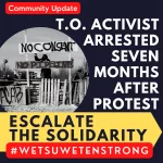 from Mining Injustice Solidarity Network In a bizarre series of events, an anti-racist, immigrant rights organizer was charged yesterday by CP Rail Police in Toronto on an open warrant related to a Wet’suwet’en solidarity action that took place seven months ago in […]