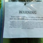 from Scenes from the Atlanta Forest Last night we randomly inoculated dozens of trees with steel and ceramic spikes to protect against felling by chainsaw. Signs were posted in English and Spanish to alert workers. This process is harmless to the trees, […]