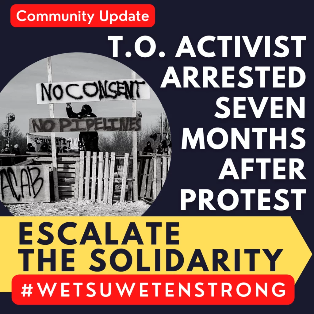 In a bizarre series of events, an anti-racist, immigrant rights organizer was charged yesterday by CP Rail Police in Toronto on an open warrant related to a Wet’suwet’en solidarity action that took place seven months ago in November 2021.