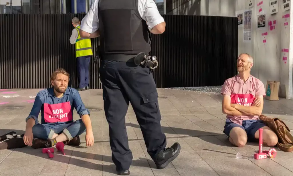 Activists targeted the News UK building next to London Bridge station early on Tuesday morning, destroying glass panels and putting up posters reading “tell the truth” and “40 degrees = death” next to the entrance used by journalists at the Sun and the Times.
