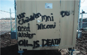 Graffiti on electrical equipment in Boone County, Iowa next to a pipeline damaged by Ruby Montoya and Jessica Reznicek on March 18, 2017. Photo source: US Federal District Court, S.D. Iowa.
