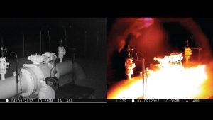 Two security camera stills of one instance of sabotage to DAPL used as evidence in the prosecution against Montoya and Reznicek.