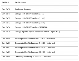 On the morning of the first day of sentencing, federal prosecutors filed an unsealed document containing a list of more than 80 exhibits they intended to use at the hearing that day. Most of the items on the list are public statements made by Montoya about her actions as well as assessments and images of the damage her and Reznicek caused to fossil fuel infrastructure. At the end of the list, as seen below, are five exhibits titled Transcript of Proffer Interview and Grand Jury Testimony dated from November 2020 to July 2021.