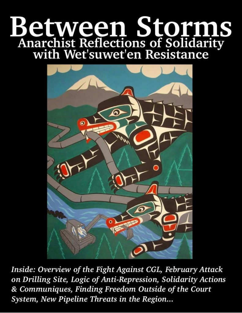We have assembled this publication in solidarity with the ongoing Wet’suwet’en resistance to industrial expansion. This struggle for Indigenous self determination and land defence has become a landmark moment of rupture across the colonial nation of Canada and beyond. We felt the need to compile this zine in an effort to take a step back and witness the breadth and fierceness of these last few years – with a particular focus on the year that has just passed since the start of ‘Coyote Camp’ and the specific battle against the attempt to drill under Wedzin Kwa. Not to produce some stale collection for the history shelves, but to inspire and learn from these events as they continue to unfold. As we go to print, CGL has just begun the drilling under the river that many have fought so hard to prevent. It’s a sad day and this part of their destruction will have devastating effects. But this doesn’t mean that this fight has been in vain, the project is not complete and opportunities for intervention abound.
