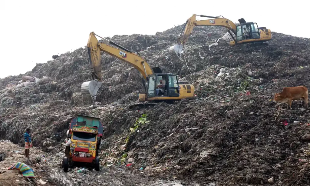 A rubbish dump in Gazipur, Bangladesh. Methane gas is released from decomposing organic waste. Photograph: Syed Mahabubul Kader/Zuma/Rex/Shutterstock