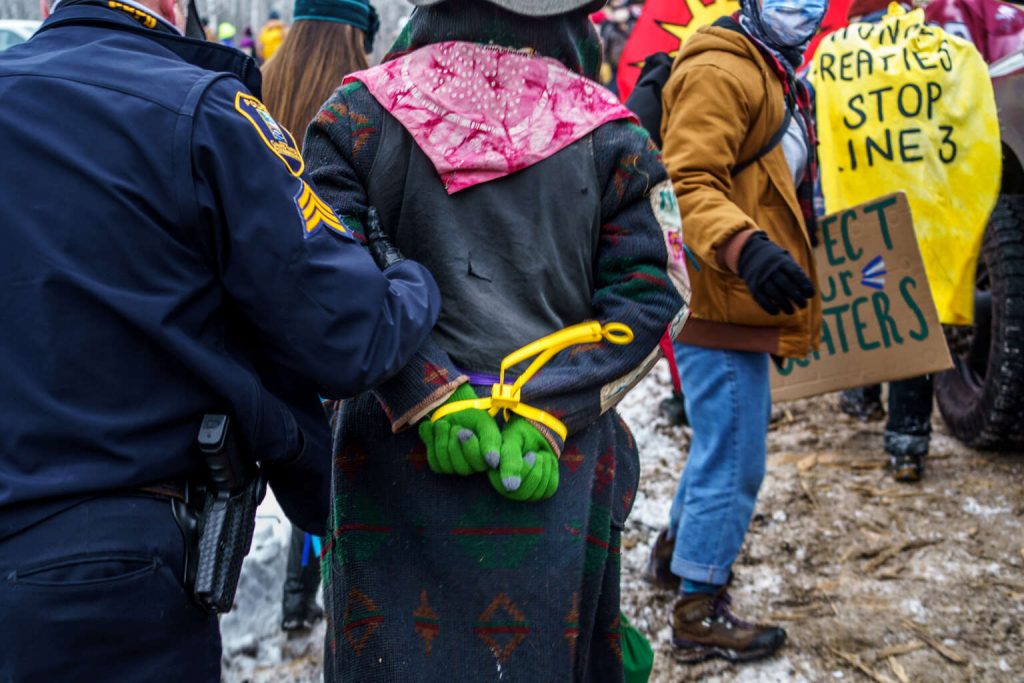 From late 2019 through 2021, at least 115 Water Protectors were arrested in Aitkin County, Minnesota (population 15,800) for their resistance to Enbridge Inc.’s Line 3 tar sands pipeline. Today, 50 defendants continue to face charges, according to Marla Marcum of the Climate Disobedience Center, which has been tracking cases and offering support to defendants. Open cases include seven social media-based prosecutions including of Winona LaDuke, co-founder of the Native advocacy organization Honor the Earth, and Tara Houska, an administrator of the Giniw Collective. These cases, which reference social media activity in charging documents, have produced trumped-up charges ranging from “harassment of law enforcement” for yelling to charges that derive from Minnesota’s 2002 Anti-Terrorism Act, which was passed in response to the September 11 attacks.