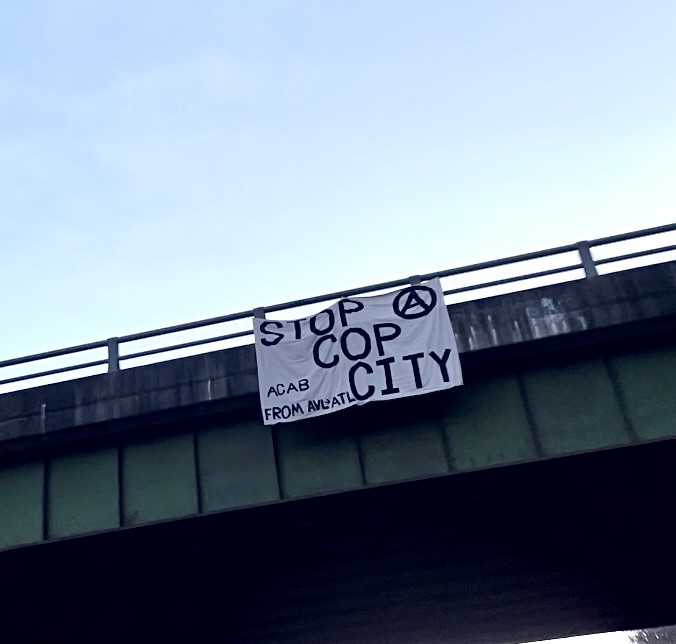 On the morning of December 27th, two banners were dropped over interstate 40 in so called Asheville, North Carolina to show unwavering support and solidarity with 6 comrades in Atlanta Georgia that were arrested and charged, most notably, with domestic terrorism while defending Weelaunee forest from capital development and state violence. We stand militantly against capital interest to further the rapid gentrification of South Atlanta and development of the entertainment industry. We stand militantly against the states interest in providing tactical training to its agents (as well as international agencies) to repress growing opposition movements that will be forthcoming as a by product of the disintegration of capitalism and state legitimacy. We hope this small act of solidarity kindles a fire and rage in others to stare into the eyes authoritarians, fascists, and oligarchs alike, and to negate them by any means necessary.