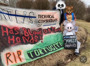 The Weelaunee Forest in Atlanta is the proposed site of a massive police training facility, known to most as “Cop City.” Cop City is the logical outgrowth of violent, racialized capitalism in the United States. Corporations and wealthy Atlantans believe that they need a large and well-equipped police force to tamp down “crime” in the city they are working to gentrify, and have thus contributed financially to this project. As landlords and cops push Black residents out, wealthy, mostly white neighborhoods like Buckhead demand ever more police intervention to keep them and their ill-gotten wealth “safe.” With all their militarized training, equipment, and qualified immunity from prosecution, police murder thousands of people per year — disproportionately Black, Brown, and Indigenous. This facility will contribute to further militarization and deadly force for police departments across the country to utilize and train in. Although this is most urgently a movement to protect the forest in Atlanta, it is also a national movement to confront the violent system of policing. A decentralized, autonomous movement has formed in 2021 to stop this project from going forward. There have been a wide diversity of tactics: from working inside of the city- and state-government, organizing petitions and letter writing campaigns, and calling upon investors and contractors to divest from Cop City — to more on-the-ground resistance such as encampments and gatherings in the forest itself. There have been a number of armed raids on those occupying the forest by local and state police, most recently culminating in the the murder of 26 year old indigenous medic and activist, Manuel “Tortugiita” Paez Teran (they-them) by Georgia State Patrol Officer(s).* As activists mourn the loss of Tortuguita, we continue to fight the murderous endeavor that is Cop City with all of the tools that we have. There is a role for everyone to take part in defending the Weelaunee forest, and that is why we here in Massachusetts have chosen to confront Atlas Technical Consultants (ATC) today. Atlas Technical Consultants (ATC) is an engineering consulting firm that is working with contractor Brasfield and Gorrie to build the Cop City project. ATC has over 100 offices in the US. Atlas Technical Consultants of Avon is one of three locations in Massachusetts. ATC prides itself as being a corporation of diversity, inclusion, and sustainability. We believe that their involvement in the Cop City project blatantly contradicts these goals. In addition to the ecocidal implications of destroying a forest to build a fake city, this project has already resulted in the murder of a young indigenous person. We know that murder is the legacy of Cop City, and all who aid in its construction will only have blood on their hands. We ask ATLAS: how many more will die as a result of this atrocity? Are you and your staff ready to contend with the bloodshed you have, and will have, caused? We demand that you drop out of this racist, environmentally devastating contract and commit to the values you claim to hold.