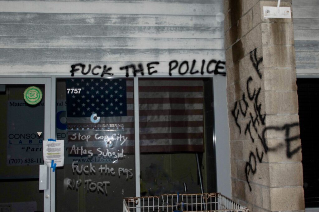 “In mid-March, 2023, anarchist comrades attacked a local Consolidated Engineering Laboratories (CEL) office in Windsor, CA, an ATLAS subsidiary, to decry their affiliation with the creators of Cop City.