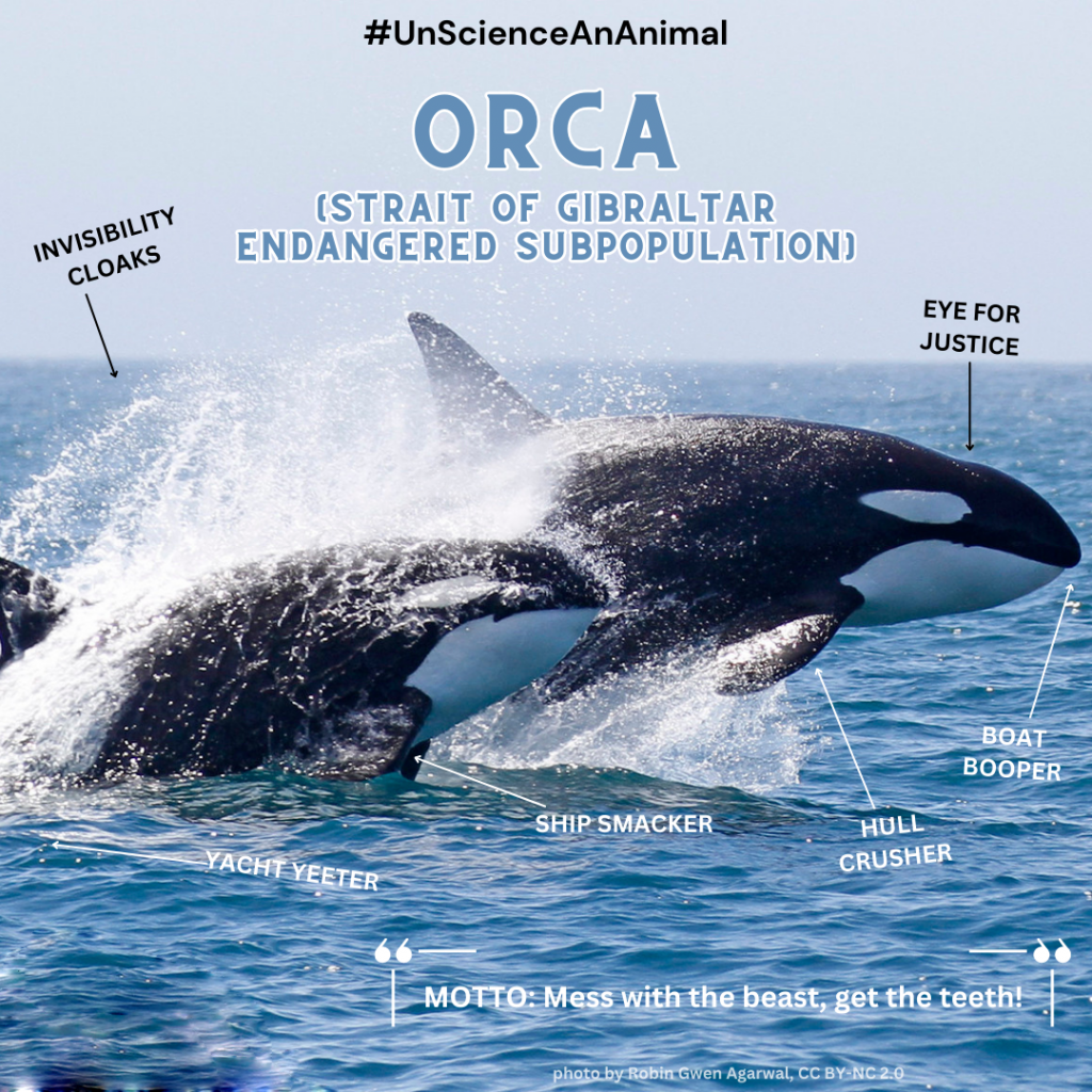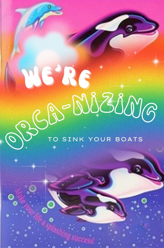 Orcas are becoming the black-and-white face of justice movements that seek liberation over profit, the welfare of the many over the power of the few, and above all: life over death. Here’s a meme that brings an orca mascot into a critique of Elon Musk’s transphobia and billionaires taking doomed $250K trips to the wreck of the Titanic.