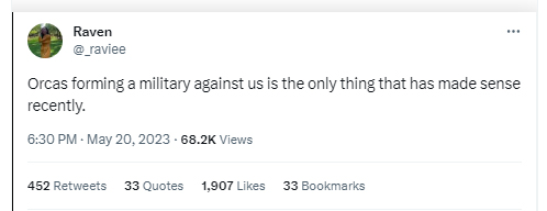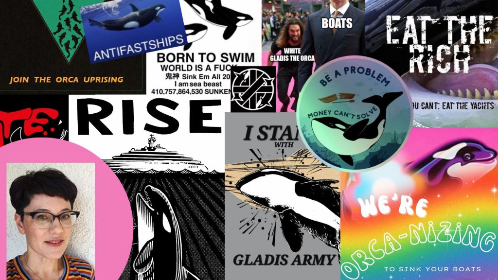 In the folk imagination, the ship-sinking orcas are linked to many current efforts, structures, and philosophies we turn to to help ourselves and each other. While scientists debate whether to call the transmission of the new ship-sinking behavior a “fad” like fish hats or “social learning,” Twitter user @jelenawoehr calls it grassroots organizing. The orcas are imagined as our allies in the labor movement, as in this tweet about David Zaslav, yacht owner and media exec embroiled in ongoing strikes by entertainment-industry workers. Methods of mutual aid such as bail funds and GoFundMe’s are proposed as support for the #OrcaUprising. Proliferating memes link the orcas to anarchy, socialism, anti-fascism, the Occupy movement, the fight against militarized borders, punk, prison abolition, and anti-capitalism.