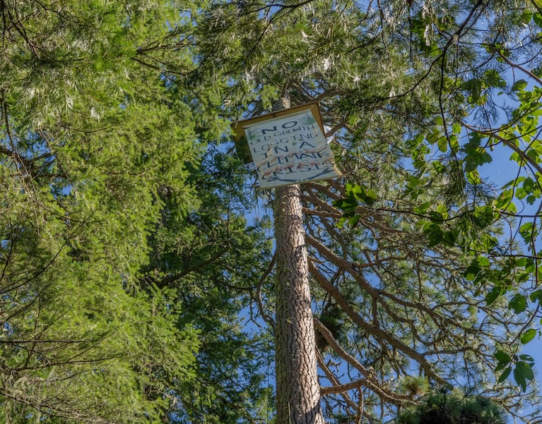 At the top of one of these trees, a massive Ponderosa pine with a thin band of orange paint around its trunk, a big banner reads: “No Old Growth Logging in a Climate Crisis.” There’s a small platform attached to the trunk near the top, over 100 feet above the forest floor.