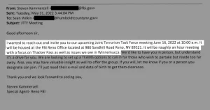 In this May 2022 email, an FBI special agent invites Nevada’s Humboldt County Sheriff’s Office to a joint terrorism task force meeting focused on Thacker Pass. Credit:Records obtained by Siskiyou Rising Tide and Information for Public Use. Highlighted and redacted by ProPublica.