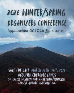 Hey Y’all! Save the Date for the Winter/Spring 2026 Organizers Conference! It’s gonna be March 27th-30th, 2026 on occupied Cherokee lands in Western North Carolina/Eastern Tennessee about an hour or so outside of Asheville, NC (the closest airport). We’ll also be quite close to Interstates 81 and Interstate 40.