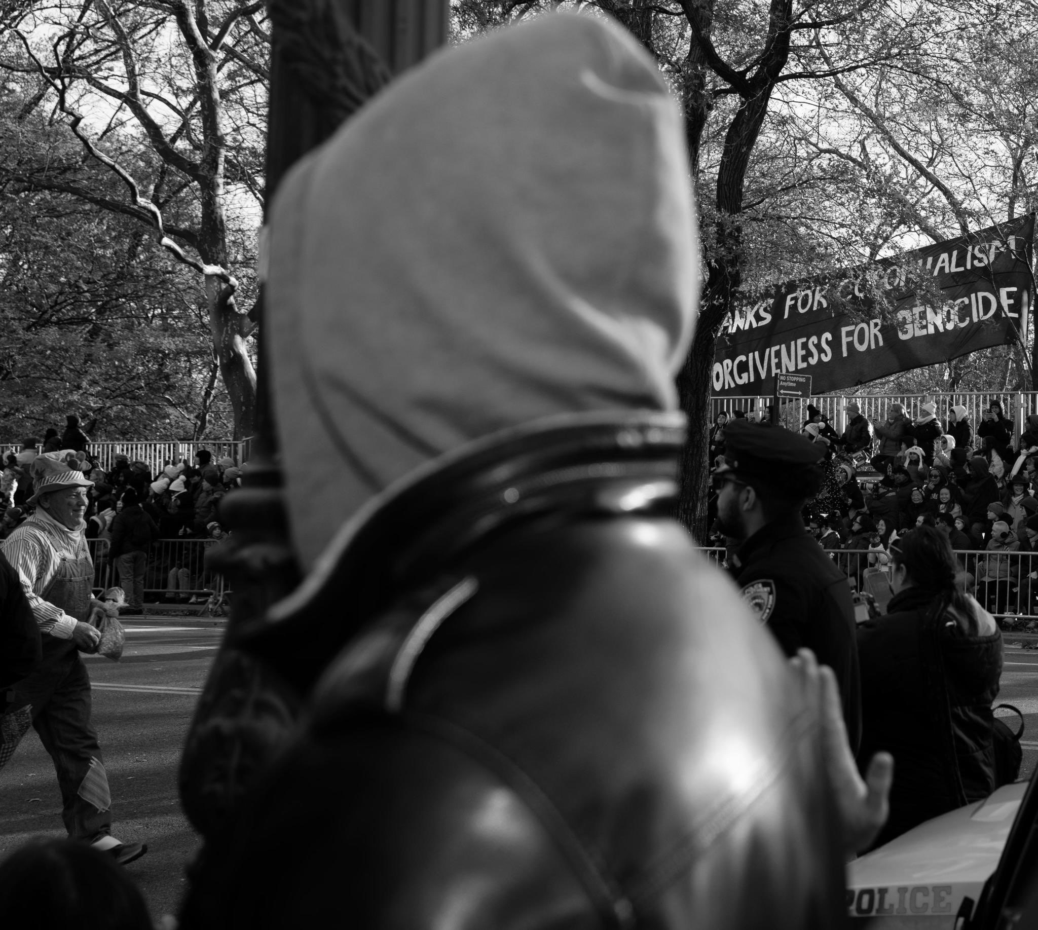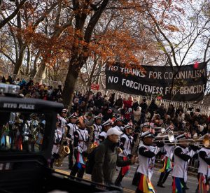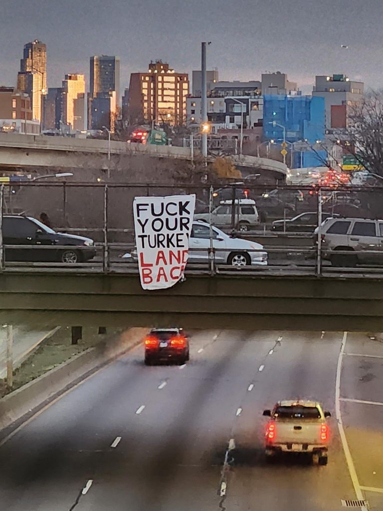 An autonomous group dropped a banner as the Macy’s Thanksgiving Day Parade began on Central Park West in New York City today. Its message, NO THANKS FOR COLONIALISM, NO FORGIVENESS FOR GENOCIDE, hung along the route for the duration of the parade, a crack in the highly surveilled and commercialized spectacle of colonial amnesia. At the same time, across the bridge in Brooklyn, another autonomous group dropped a banner from the BQE, reading FUCK YOUR TURKEY, LAND BACK—a moment of confrontation for people driving upstate for their business-as-usual Thanksgiving celebrations.