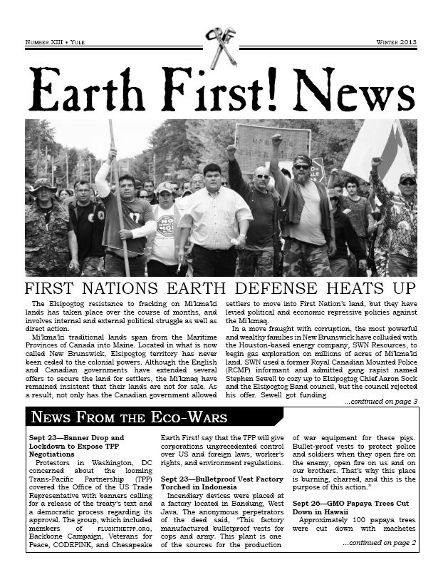 This is the thirteenth edition of Earth First! News, available for Winter Solstice 2013. This issue compiles three months of news from the front lines of ecological resistance. Download the free pdf, or view online. Print and distribute freely. This newsletter includes: