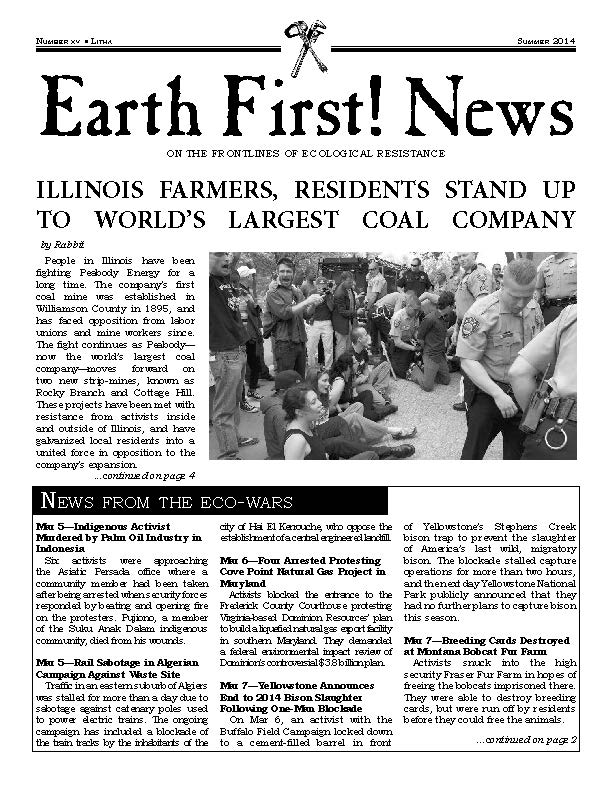 The fifteenth edition of Earth First! News was released for Summer Solstice 2014. This newsletter compiles three months of news from the front lines of ecological resistance. Download the free pdf or read online, and print and distribute freely. This newsletter includes: