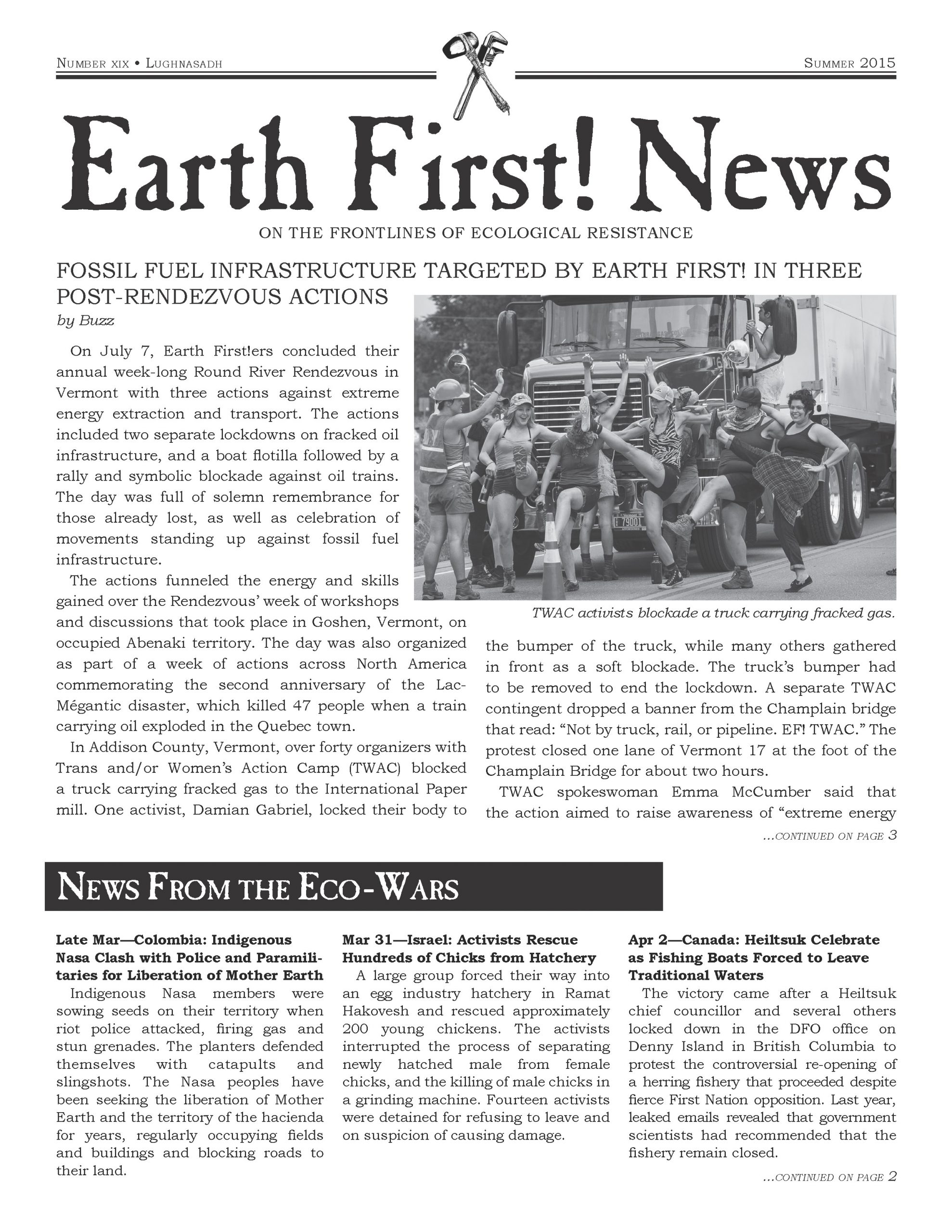 This edition of the Earth First! newsletter contains updates of environmental actions around the world, a featured article on fossil fuel resistance in the northeastern US, eco-prisoner updates and addresses, and a directory of eco-action groups. Read online or download for free!.
