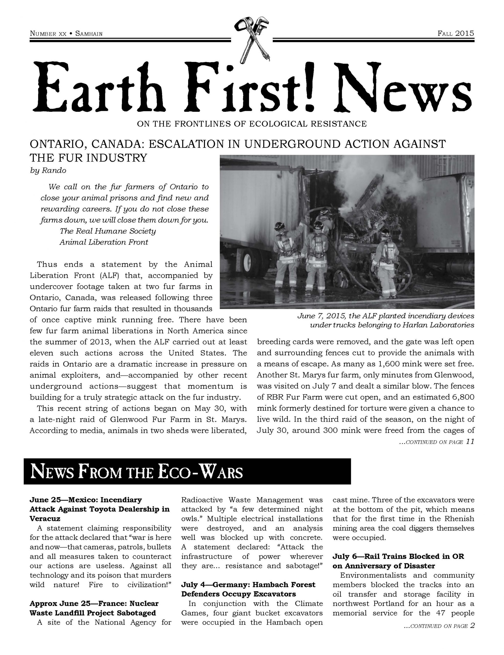This edition of the Earth First! newsletter contains updates of environmental actions around the world, a featured article on ALF actions in Ontario, Canada, eco-prisoner updates and addresses, a directory of eco-action groups, as well as a call for support from the ZAD and an announcement of a new prisoner publication. Read online or download for free!